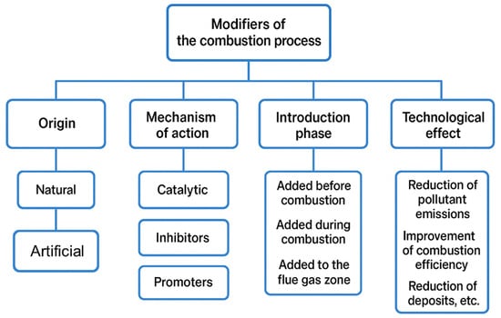 There are many types of modifiers, and their use depends on the nature of the combustion process and the desired end results. Generally speaking, modifiers play a significant role in pulverized coal combustion, as they can improve the efficiency and purity of this process. However, selecting the appropriate modifier is a complex issue that requires special attention [31]. The incorrect selection of substances, or their excessive use, can lead to undesirable consequences, such as reduced combustion efficiency or increased emissions of harmful byproducts [32]. By actively influencing the chemical reactions occurring during combustion, modifiers can lower the process temperature, increase its efficiency, reduce pollutant emissions, and improve combustion stability and control. Therefore, they constitute a key element in the development of technologies that aim for a more efficient and environmentally friendly use of pulverized coal [33]. Pulverized coal combustion modifiers can be classified based on various criteria. A sample summary is presented in Figure 5.