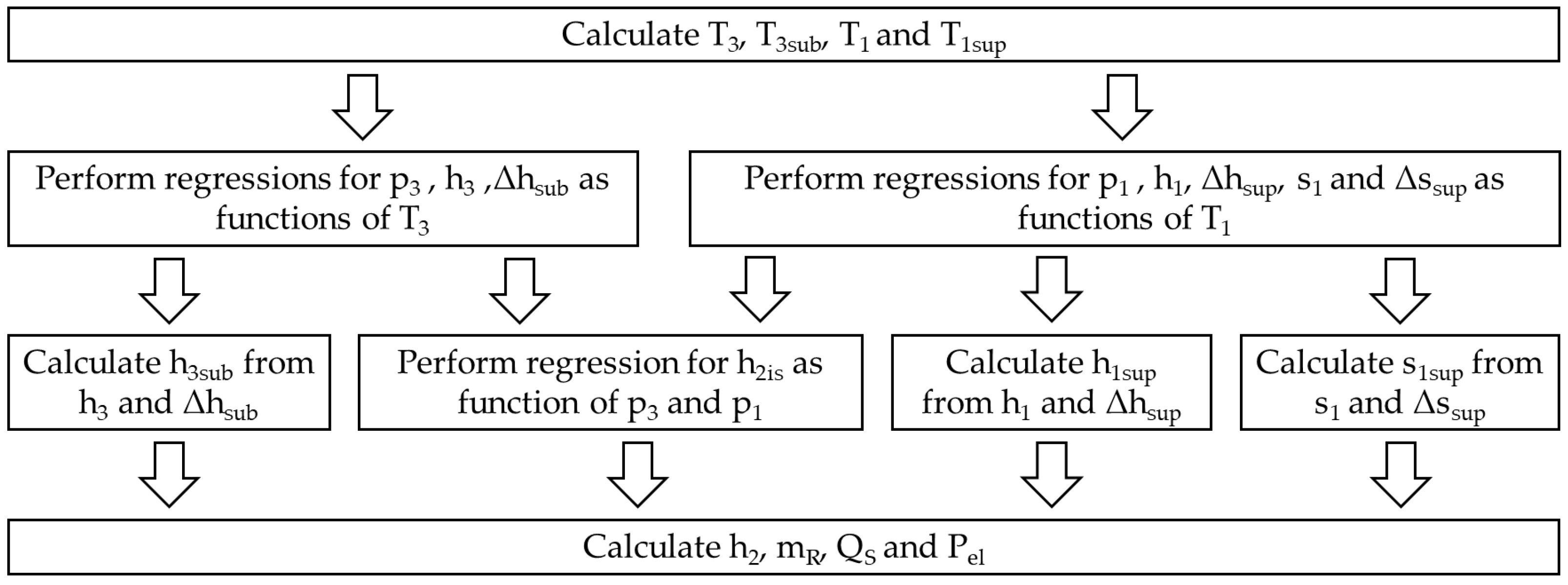 The upper pressure level and enthalpy h3 can be calculated from the temperature T3. The enthalpy change from state 3 to 3sub, resulting from the subcooling, must then be calculated. Equation (19) has been set up for this purpose, which, starting from a temperature level of T3, indicates how large the enthalpy change is per temperature change. The result of this equation multiplied by the subcooling temperature Tsub is added to the enthalpy h3 to calculate the enthalpy h3sub (20). Δhsub, Δhsup, and Δssup describe the rate of change in enthalpy or entropy per change in temperature during subcooling or superheating at a given temperature level.