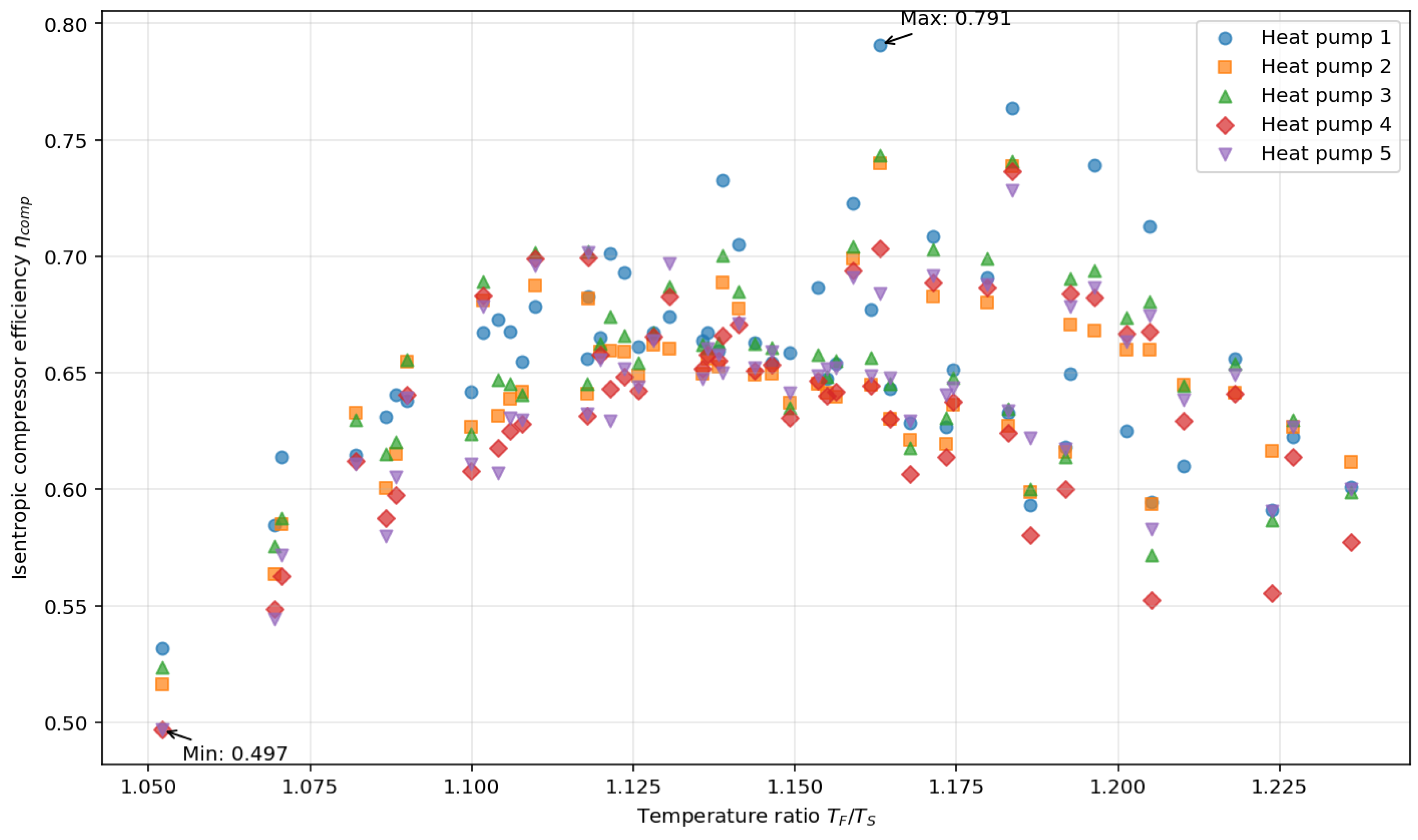 Figure 3 shows the isentropic compressor efficiency of all heat pumps in dependency of the temperature ratio, which has the highest coefficient of determination.