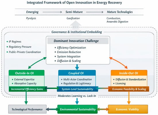 Modern innovation activities in the area of energy recovery are increasingly marked by a paradigm shift from a more isolated, technology push-oriented approach to innovation to more networked and interdependent innovation patterns. Whereas the initial innovations in energy recovery technologies have been mainly the result of internal engineering and process optimization, modern innovation activities are increasingly based on external know-how sources, cross-industry collaboration, and integration into digital and regulatory infrastructure systems [1,2,14]. Technological innovations in such areas as materials, process control, emission sensing, and optimization have increasingly evolved outside the domain of the traditional energy recovery companies, needing efficient mechanisms to absorb external know-how [15,16,17]. At the same time, the innovation process in the area of energy recovery is heavily driven by environmental regulation, public policy goals, and wider system constraints associated with waste management and energy infrastructure, increasingly supporting a more collaborative and ecosystem-oriented innovation approach [18,19,20]. Consequently, the innovation process associated with energy recovery technologies is currently a socio-technical process where technological developments, organizational capacities, and institutional conditions are increasingly coupled together, forming a situation where open innovation not only presents advantages but quite often is a necessary strategy to ensure modern technological development and integration [14,21,22].