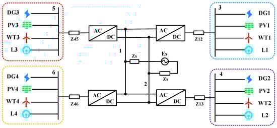 The new distribution system is tested based on a 10 kV voltage level and a 50 Hz power frequency standard. The AC inverter-based sources are modelled using an ideal balanced node model; under fault conditions, they are equivalently represented by a subtransient model. The system is configured with four photovoltaic generation units and four wind power generation units, each with a rated capacity of 1 MW. The control system adopts a d-axis oriented control strategy based on the voltage at the PCC, with the objective of complete suppression of negative-sequence current. Detailed electrical parameters of the system components are listed in Table 3.
