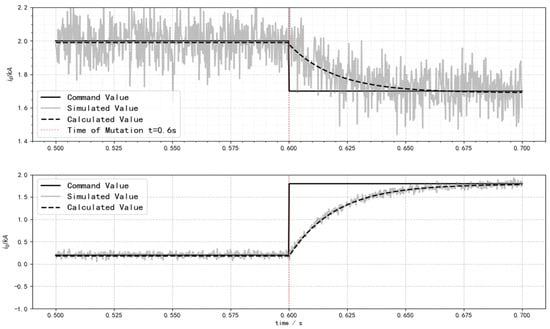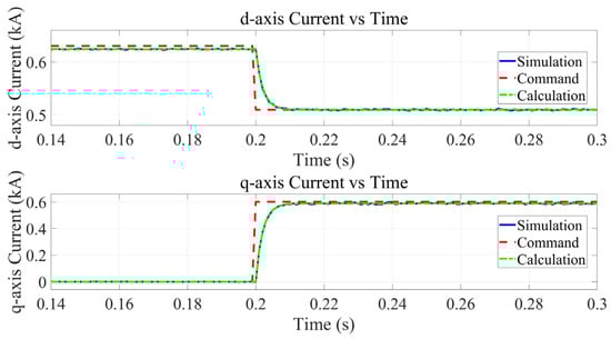 To analyze the dynamic characteristics of current responses in the synchronous rotating coordinate system, a synchronized comparison framework for d-q axis current command values, simulated values, and theoretical values was established, as shown in Figure 7. The control system achieves real-time current command reconstruction based on power-voltage coupling relationships, with the SIMULINK simulation data exhibiting exponential dynamic tracking characteristics. The current trajectories calculated by the proposed algorithm correspond closely to the transient process measurement data, indicating that the method effectively characterizes the transient evolution patterns of fault currents.