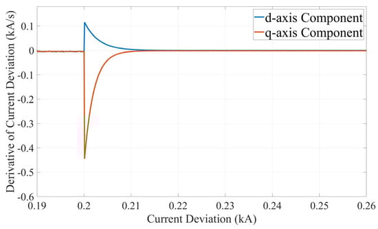 According to the mathematical derivations in Section 2.2, the phase trajectory of the error signal is theoretically characterized by a linear function. To validate this, the time-domain waveforms of the -axis current deviations were obtained through simulation, as shown in Figure 4. These deviation signals serve as the necessary input for the phase plane reconstruction. Subsequently, the signals were denoised and differentiated to generate the phase plane plot depicted in Figure 5. The resulting trajectory reveals a distinct linear relationship between the deviation and its derivative, which empirically confirms the consistency between the simulation results and the theoretical conclusions derived in Section 2.2.