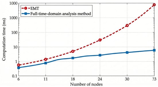 In order to assess the scalability and real-time feasibility of the proposed method in larger grids, comparative tests on computational efficiency were conducted against the traditional EMT simulation method using distribution networks ranging from 6 to 33 nodes. The topology of the test networks is consistent with the structure shown in Figure 2. Figure 8 illustrates the computation time required by both methods across different node scales. It can be observed that as the system size expands, the computation time for the traditional EMT method exhibits an exponential growth trend, which is primarily attributable to the increased computational load of step-by-step numerical integration. In contrast, the proposed full-time-domain analysis method maintains a stable and moderate linear increase in calculation time. Regardless of the node expansion, the total execution time remains within a manageable range. These results indicate that the proposed method effectively reduces computational complexity, supporting its feasibility for real-time applications in large-scale distribution networks.