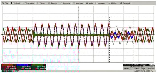 To further accurately characterise the dynamic characteristics of short-circuit currents in new energy inverter-based power supplies, it is necessary to extend the analysis beyond steady-state fault conditions and perform transient current tracking. Experimental parameters were configured with the current inner loop proportional coefficient = 0.018 Ω, integral coefficient = 0.042 Ω/s, fault duration set to 0.6 s, and PWM carrier frequency adjusted to 6 kHz. Given that transient power references are determined by the depth of voltage sag at the grid connection point, and current references are jointly resolved from power commands and real-time voltage measurements, the voltage outer loop parameters exhibit negligible influence on transient current characteristics.