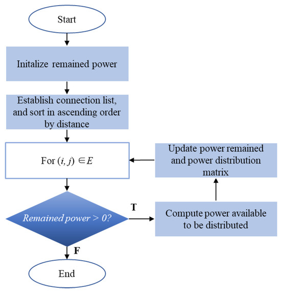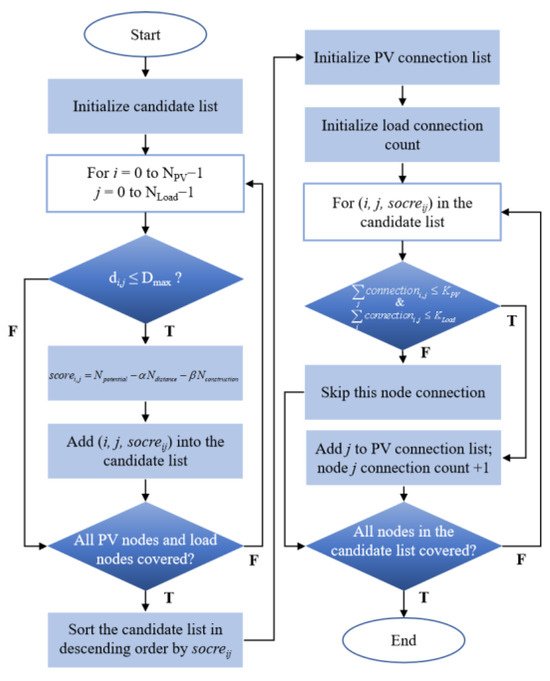 Feasible connection topology solutions will be determined in the required first-stage optimization, where computational precision requirements are modest but data volume is substantial. Therefore, a greedy algorithm is applied as a simple and efficient approach for solving the optimization problem [19]. By making locally optimal choices at each stage based on a given optimization criterion, without considering the global picture, the greedy algorithm significantly reduces computational time by avoiding the need to exhaustively explore all possible solutions. Figure 1 illustrates the general process of the algorithm for the topological interconnection optimization problem. A combined strategy of distance screening, score sorting, and greedy selection is generated to establish the prioritization of high-potential short-distance connections while satisfying connectivity constraints. It represents an efficient heuristic method for the optimization.