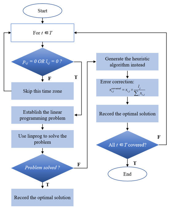 A heuristic algorithm is established as a redundant strategy, which will be generated when linear programming fails. Figure 3 shows the flow chart of the heuristic algorithm in the hybrid algorithm. The heuristic algorithm adheres to the following principles.