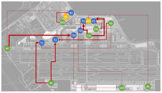 Figure 5 illustrates the evaluated connection strategy. The thicker lines indicate the greater power transmitted between the nodes, where the annual power transferred in MWh is shown in Table 2. Generally, each PV node is connected to two load nodes nearby. For example, PV nodes T3C and T3D are connected to load nodes P1 and P2. PV nodes #3 and #5 are connected to load nodes T1 and T2. Although PV node #6, SIES, and #5 have redundant green power output, little energy is transferred via these nodes, as they are located far from load nodes.