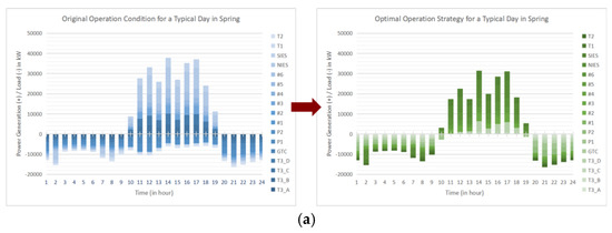 Typical daily operation strategy before and after optimization in: (a) spring; (b) summer; (c) autumn; and (d) winter.