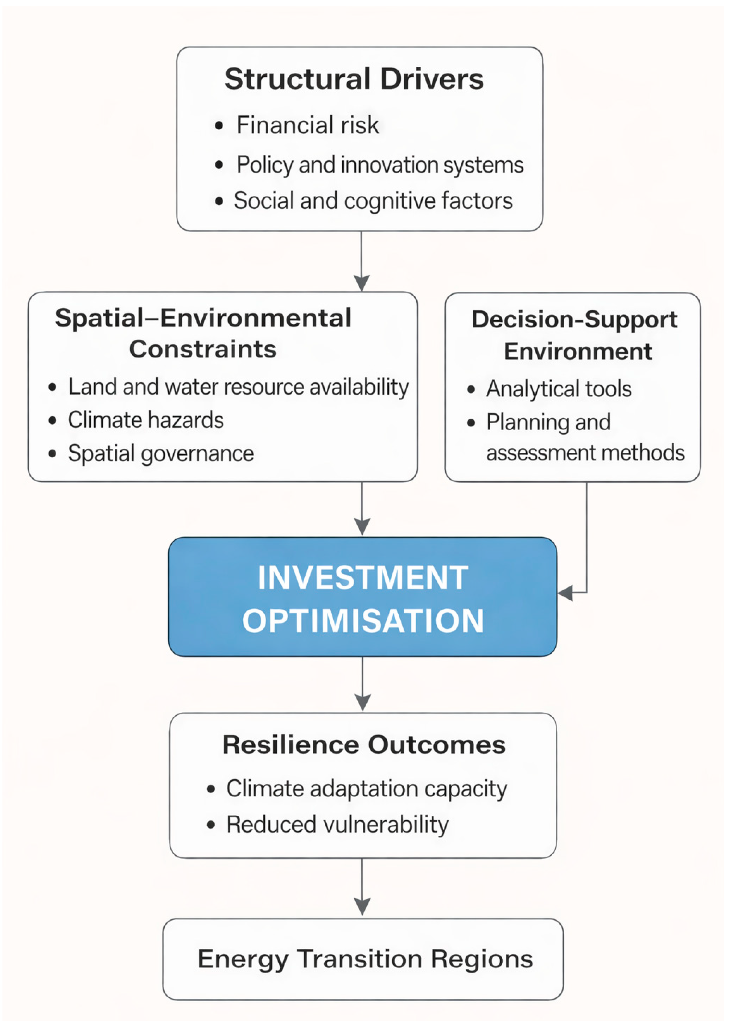 There is therefore a need for an integrative perspective that can connect these strands and support decision-making in contexts where multiple pressures interact. While existing studies have examined climate resilience, energy investment, and land-use governance through parallel or partially overlapping analytical lenses, no unified framework has explicitly conceptualised their combined and reciprocal interactions in energy transition regions. In ETRs, questions about technology portfolios, siting strategies, network reinforcement, storage and flexibility options, as well as employment, local development, and ecosystem protection, are closely interdependent [