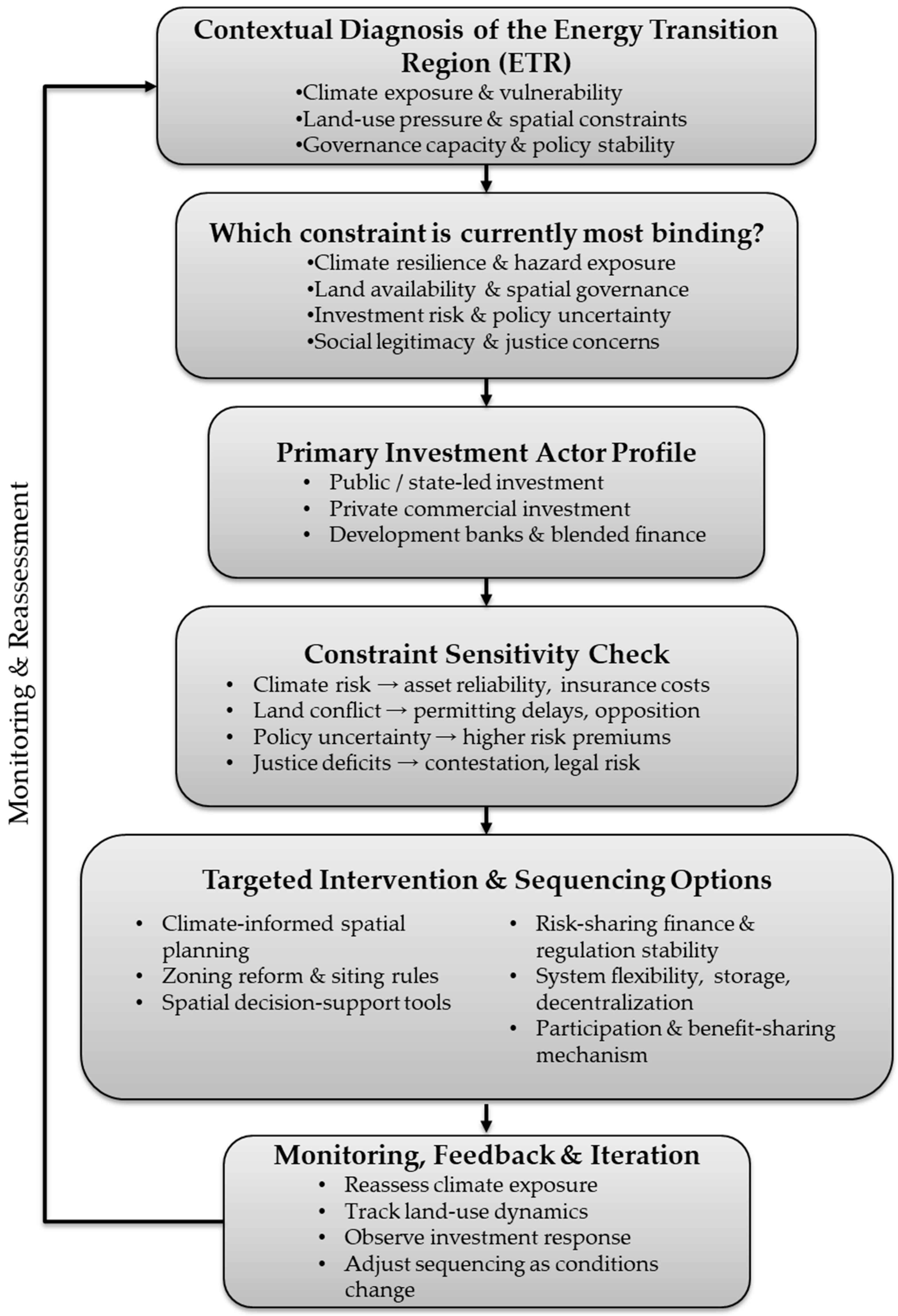Figure 2, the framework can be operationalised through a hybrid decision-tree logic that guides decision-makers through (i) contextual diagnosis of regional constraints, (ii) identification of the dominant binding bottleneck, (iii) differentiation of investment actor profiles, and (iv) selection and sequencing of targeted spatial, financial, technical, and governance interventions. By embedding feedback loops, the framework also supports adaptive reassessment as climate, market, and policy conditions evolve.