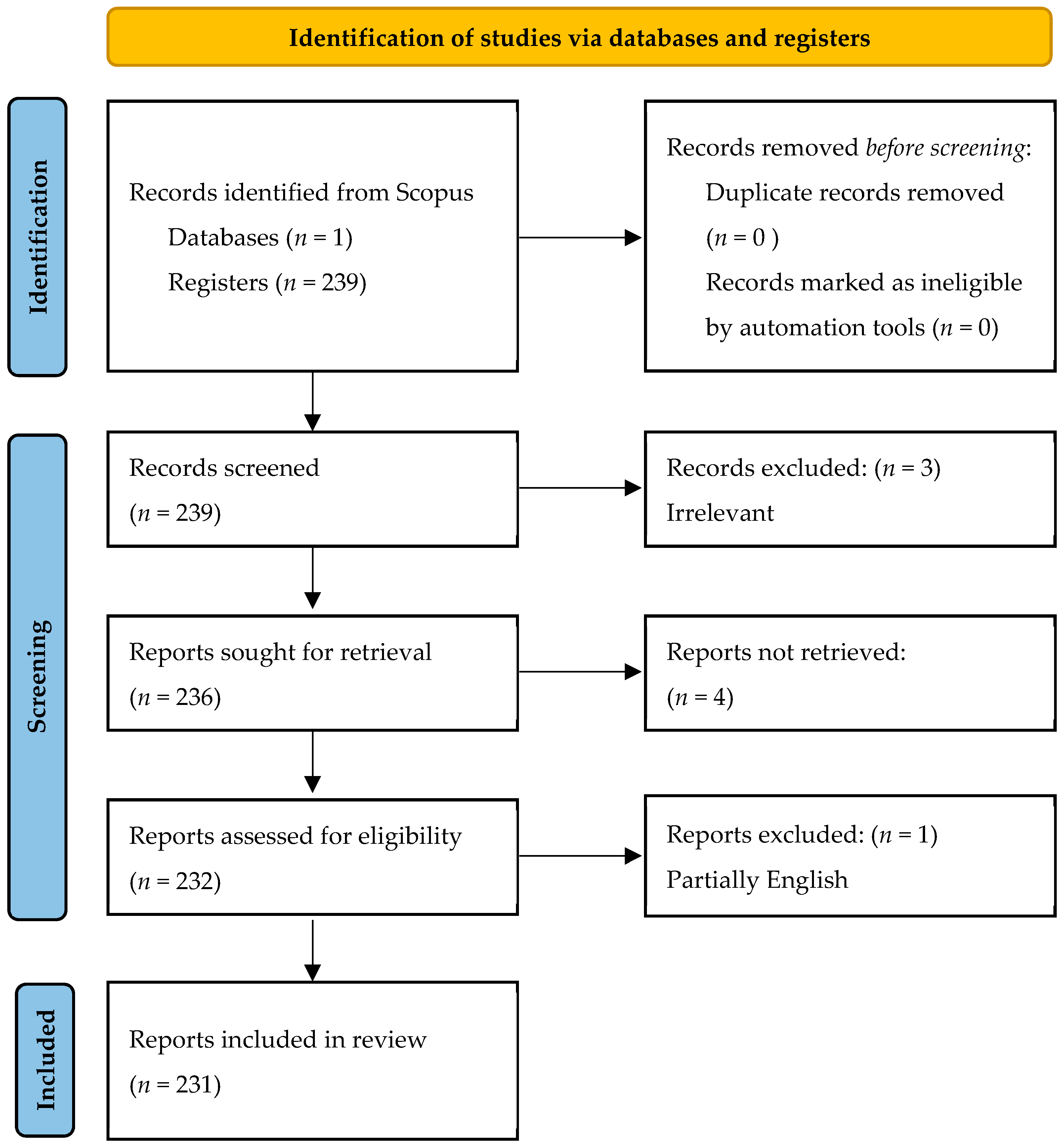 55]. Exploratory quantitative mappings used during the analytical process, involving (a) documents by year, (b) documents by subject area, (c) documents by country or territory, and (d) the VOSviewer version 1.6.20 co-occurrence network, are documented in