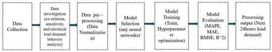 The general structure of the proposed load forecasting methodology is depicted in Figure 1. The process starts with collecting and analyzing data, which includes analyzing load behavior patterns, correlations, and sensitivities. Considering the variety of data changes, data normalization is a crucial preprocessing step that guarantees stability and consistency in ML results. To improve prediction performance, multiple kinds of neural network models are then chosen and trained using hyperparameter tuning. Performance measures, including mean absolute error (MAE), MAPE, RMSE, and coefficient of determination (R2), are then used to evaluate these models. In addition, using adjusted configuration and data behavior, the model with the highest accuracy was selected to predict the electrical load demand for the upcoming 24 h.