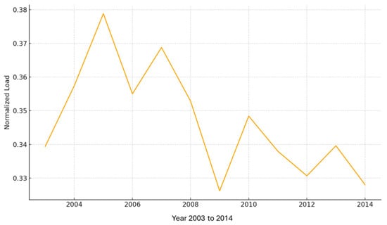 The electrical load data pattern from 2003 to 2014 is shown in Figure 2 and Figure 3, respectively, before and after load data normalization. The dataset’s intrinsic fluctuation over time and long-term demand trends in real units are highlighted by the pre-normalized load pattern in Figure 2, which represents actual load magnitude variations before preprocessing. The normalized load data is displayed in Figure 3, where the values are scaled to a uniform range while maintaining the original trend and fluctuation characteristics. The dataset is better suited for precise and reliable load forecasting due to this normalization, which also increases model stability, decreases numerical dominance, and improves data consistency. Unlike generic time-series datasets, electric load time series are characterized by strong multi-scale seasonality (daily, weekly, and annual patterns), significant dependence on external variables, such as weather and human activity, structured non-stationarity, and high sensitivity to peak demands. These characteristics require specialized forecasting models capable of capturing nonlinear and long-range temporal dependencies.