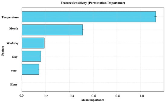 Figure 5 shows the sensitivity analysis, which is carried out using permutation importance, and highlights the relative contribution of each input feature to the load forecasting model’s prediction ability. ‘Temperature’ is the most significant factor influencing load variation among all the variables with the highest mean relevance. A significant seasonal trend in electricity use is indicated by the second most sensitive parameter, ‘Month’, which may be related to changes in the climate or usage patterns throughout the year. The moderate-to-low importance of features like weekday, day, and year suggests that they are not among the primary factors, but these parameters add some contextual value. Hour has a relatively low sensitivity, which might indicate that its predictive power is already captured by other temporal variable changes that are controlled internally by model dynamics. As per this paper, temperature and month should be given priority when entering data into the model. To increase efficiency, less essential variables may be improved or eradicated during model optimization.