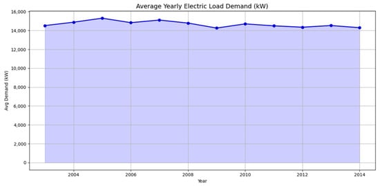 According to the plot in Figure 6, the average demand fluctuated between 14,200 kilowatts (kW) and 15,300 kW over the 12 years. Each point represents the average annual load in kW for the corresponding years. In 2006, we saw the highest demand, which was followed by a modest decrease in 2007 and another modest peak in 2008. In 2009, the load exhibited a slow, gradual decline with just slight annual fluctuations. In 2010 and 2014, we saw the demand fall to its lowest level, suggesting potential shifts in consumer behavior, system effectiveness, or economic conditions during those years.