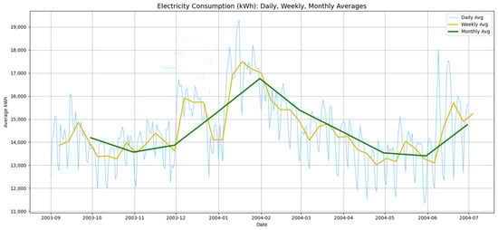 Figure 10 shows the (daily, weekly, and monthly) average usage of power in kWh, illustrating the patterns of consumption from September 2003 to July 2004. With the transition from summer demands to winter temperatures, the monthly averages show a slow decline in use from September 2003 to January 2004. The minimal electricity usage from February to April 2004 coincided with constant energy needs. This information reveals that the power demand fluctuates seasonally, peaking during months of severe weather and decreasing during times of moderate temperatures.
