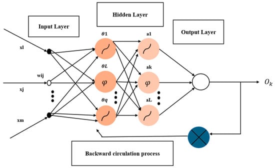 The block diagram in Figure 13 illustrates the three main layers that comprise a BPNN architecture: an input layer, one or more hidden layers, and an output layer. Parameters such as temperature, time, or past electrical demand ‘x1 to xm’ are the network inputs, which are sent to the input layer and then transmitted to the hidden neurons via the changes in weighted connections ‘Wij’ [34]. Each hidden neuron represents convoluted nonlinear interactions by calculating a weighted sum of inputs and applying a nonlinear activation function (such as a rectified linear unit) represented as φ with accompanying biases θ. After that, the output layer receives the activated outputs (a1 to aL) and generates the final prediction output ‘ok’, which, for regression tasks, is usually used for linear activation [34]. For the purpose of modifying weights and reducing loss, the backpropagation technique is used to propagate the error backwards: