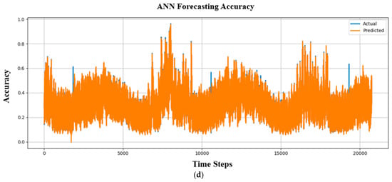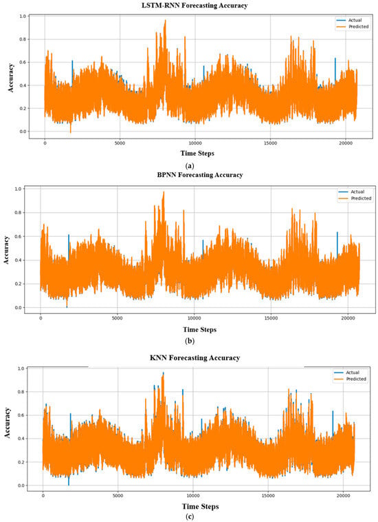 Figure 17 shows the temporal evolution of forecasting accuracy across approximately 20,000 time steps. In each subfigure, the blue curve represents the actual values, while the orange curve denotes the predicted values. A close overlap between the two curves indicates stable and consistent forecasting performance over time. As shown in Figure 17a, the LSTM-RNN model maintains a high level of alignment between actual and predicted accuracy trends over extended time horizons. Although minor deviations occur during periods of rapid variation, the overall temporal behavior is well preserved. This indicates that the LSTM-RNN effectively captures long-term temporal dependencies, which are important for maintaining stable accuracy in STLF tasks.