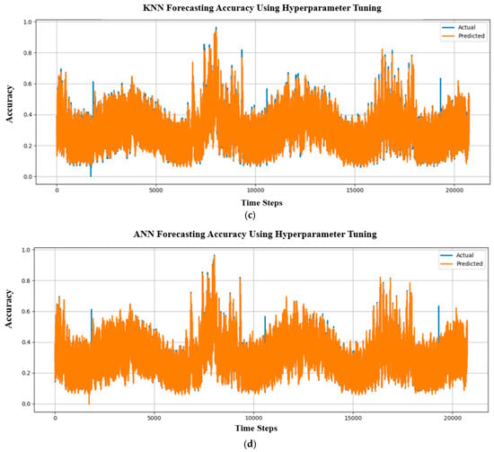 Forecasting accuracy comparison between actual and predicted hyperparameter tuning outputs for (a) LSTM-RNN, (b) BPNN, (c) KNN, and (d) ANN.