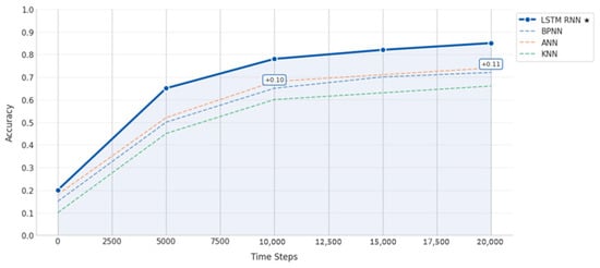 Due to their capacity to handle temporal dependencies through built-in memory cells that learn patterns across time steps, hyperparameter-tuned LSTM-RNNs perform better in electricity load forecasting than other neural networks (BPNN, ANN, and KNN), as illustrated in Figure 19. This is especially important for load forecasting, where load demand is dependent on historical patterns. To prevent overfitting and capture both short-term fluctuations and long-term trends, such as daily cycles and seasonal changes, LSTMs can optimize hyperparameters like layer depth, dropout rates, and hidden units. In comparison with simpler networks that have trouble with time-series data, their gated architecture (input, forget, and output gates) automatically maintains pertinent past information and eliminates noise. As demonstrated by the outcomes, which consistently retain higher performance (+0.10 accuracy increases to +0.11) throughout all time steps when compared to other models, LSTMs are able to attain superior accuracy by leveraging a combination of architectural advantages and targeted efficiency improvements.