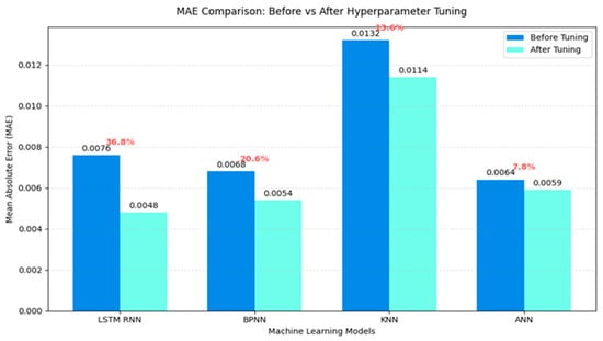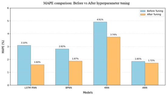 The MAE and MAPE comparison graphs illustrate the impact of hyperparameter tuning across models in Figure 21 and Figure 22. The LSTM-RNN showed the most significant improvement, with its MAE reducing by 36.8% (from 0.0076 to 0.0048) and MAPE decreasing from 3.10% to 1.60%. While MAE decreased for all models, ANN continuously maintained low errors (MAE 0.0064 to 0.0059, and MAPE 1.85% to 1.72%), whereas KNN continued to be the least reliable, even after tuning (MAPE 4.91% to 3.74%). These results demonstrate the higher tuning adaptability of LSTM-RNN, but the stable performance of ANN points to a near-optimal initial setup.