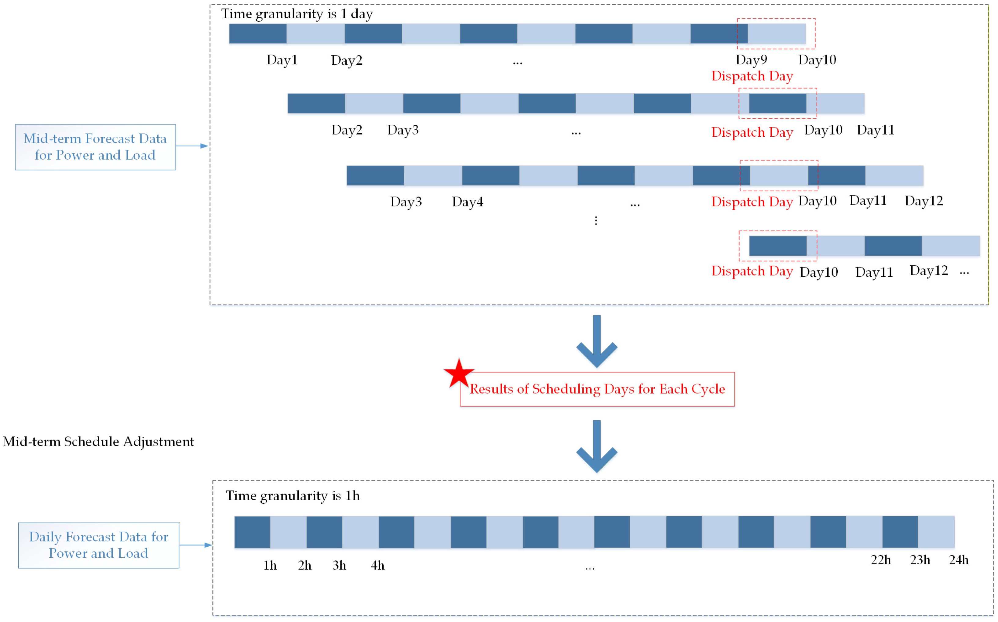 - The established long-term/short-term-to-day-ahead coupled scheduling framework dynamically switches between long-term and short-term scheduling modes by predicting the duration of intermittent output from renewable energy sources (3 days/10 days). It utilizes the results from long-term and short-term scheduling to refine the boundary conditions for day-ahead scheduling. Compared to conventional day-ahead scheduling, this framework reduces curtailment rates and load shedding during long-duration, low-output scenarios, significantly enhancing cross-time resource complementarity and system resilience.