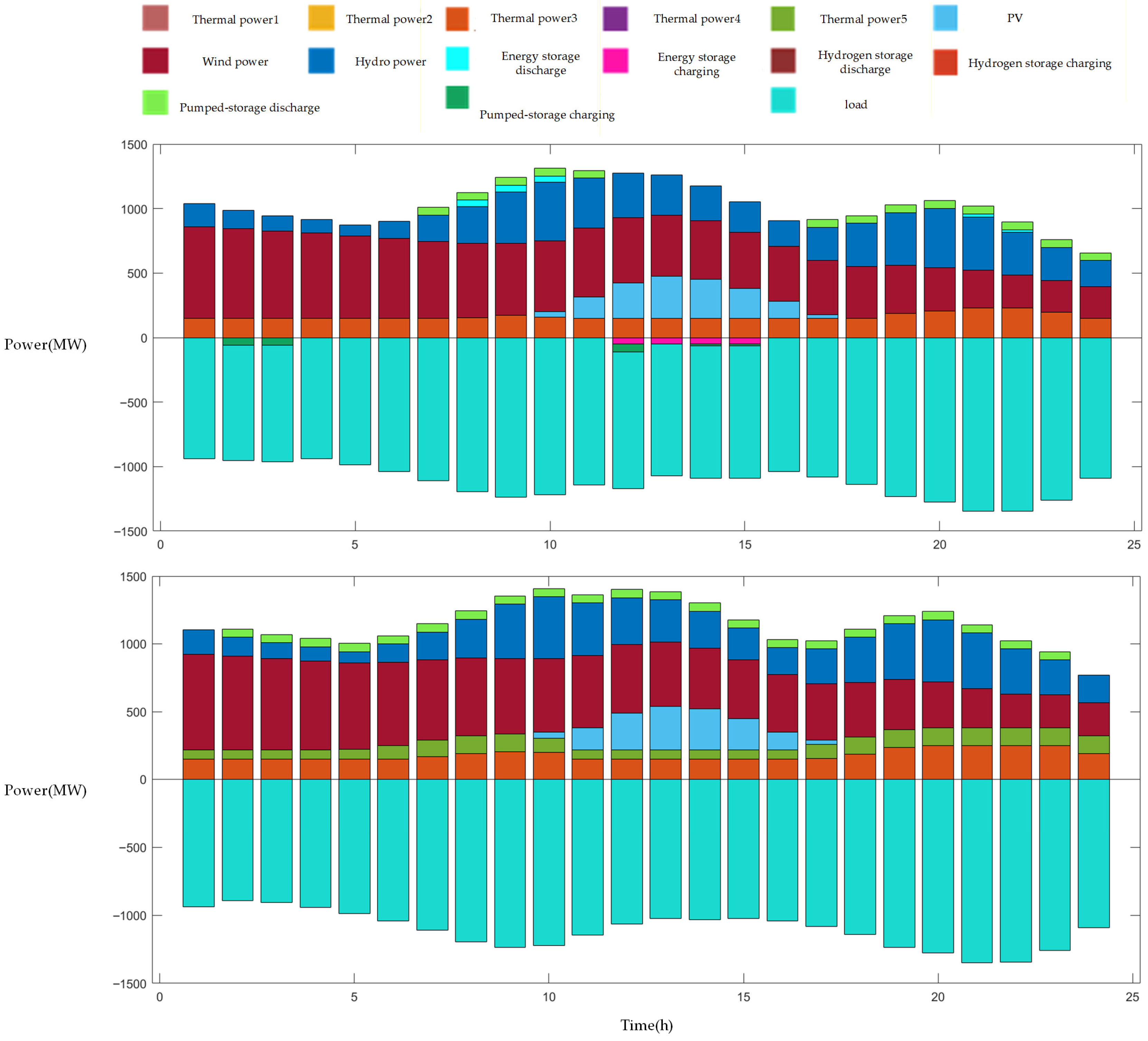 - After introducing seasonal hydrogen storage and pumped-storage hydroelectric plants, these two flexibility resources exhibit complementary characteristics in long-term scheduling: pumped storage mitigates short-term power gaps through rapid response, while seasonal hydrogen storage smooths long-term output fluctuations via cross-week energy storage. Case studies demonstrate that their synergy further reduces renewable curtailment by 0.8 percentage points and decreases system load shedding by 47.93 MW, validating hydrogen’s unique advantage as a long-duration energy storage medium.