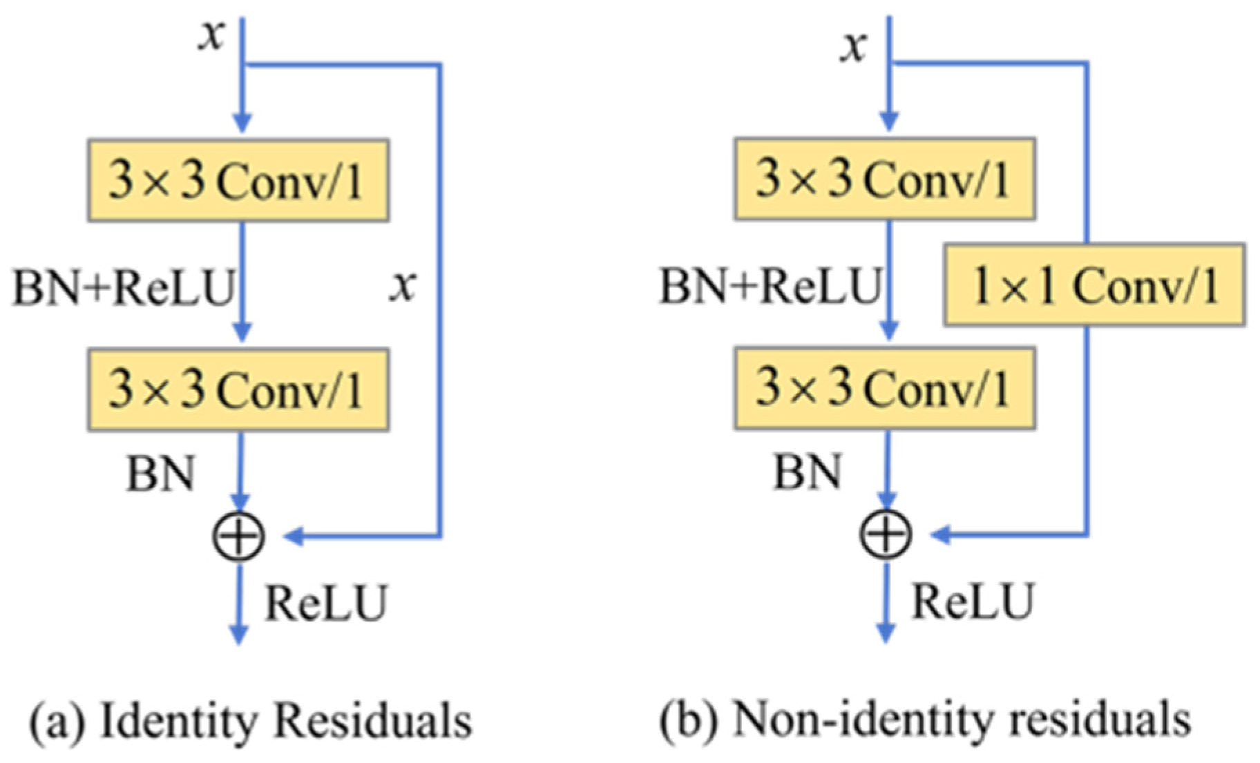 In traditional CNN, increasing the depth improves feature representation but can cause gradient vanishing or exploding, which harms performance. ResNet solves this by introducing shortcut connections that allow the output of one layer to bypass intermediate layers and be directly passed to the next. ResNet has two types of residuals: identity and non-identity. Identity residuals are used when output dimensions match, allowing direct addition. Non-identity residuals use a 1 × 1 convolution to match dimensions when they differ.