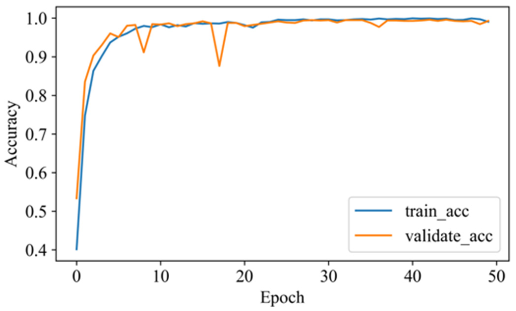 Figure 4 shows the classification accuracy curves of the model on the training and validation sets during the training process. The model from epoch 43, which achieved the highest validation accuracy of 99.8%, was selected as the final model for evaluation.