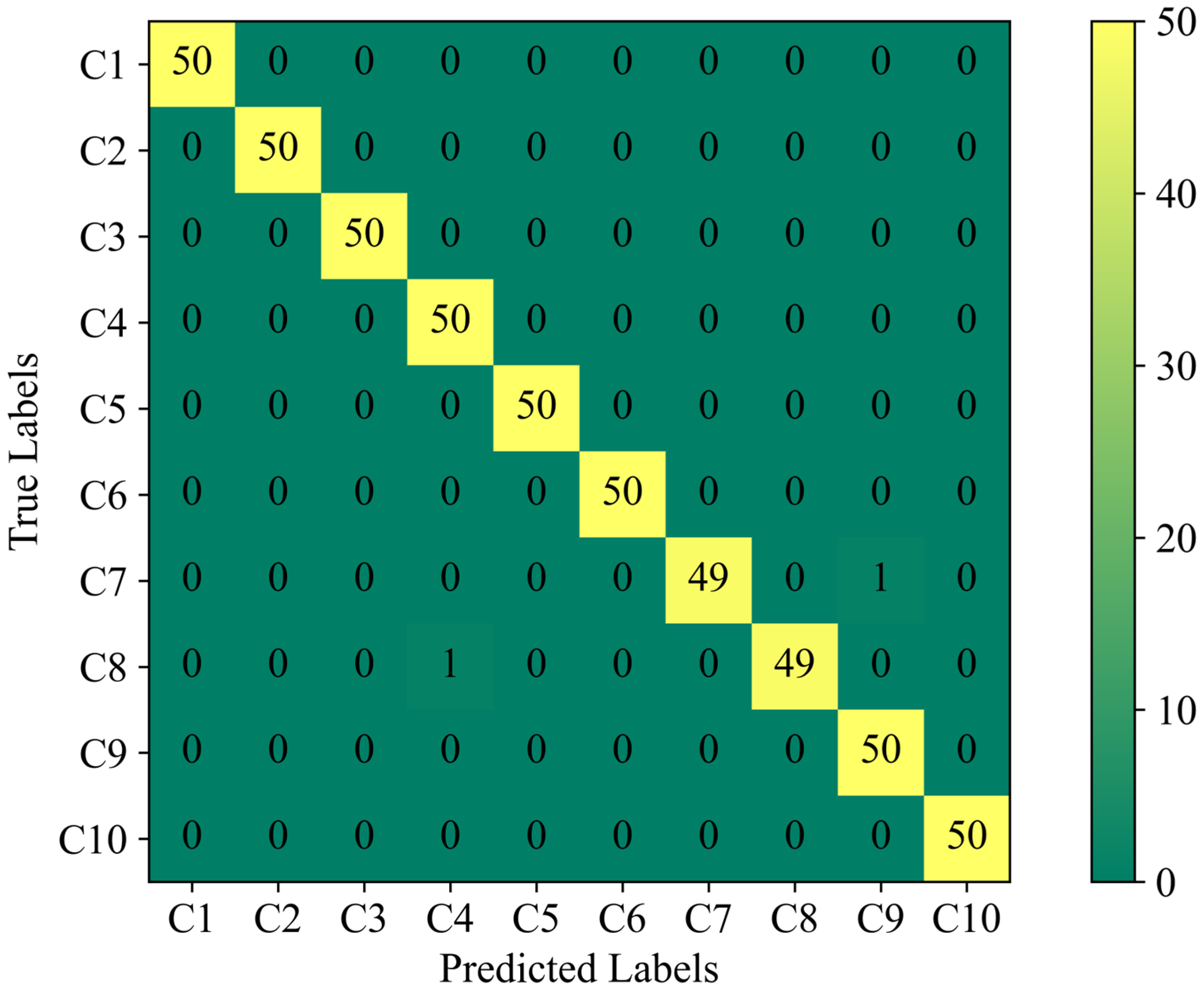 Crucially, this result effectively addresses the concern regarding potential correlations between physically similar disturbances. For instance, despite the spectral overlap between Voltage harmonics (C4) and Voltage pulse (C7), or the amplitude anomalies characterizing both Voltage surge (C2) and Voltage gap (C9), the confusion matrix exhibited zero misclassification between these specific pairs. This empirical evidence confirms that the proposed method effectively decouples these correlated features in the high-dimensional space, ensuring distinct decision boundaries even for signal types with overlapping parametric characteristics. Consequently, the overall false negative rate was extremely low, meeting the core requirement of high reliability in power system monitoring. From a macro perspective, the model achieved a Macro-average Recall of 99.60%, signifying its excellent and stable fault capture capability under balanced class conditions. Furthermore, its F1-score was also 99.60%, confirming that the model maintained a low false positive rate in addition to its minimal missed detection. These results demonstrate that the proposed multi-level ensemble architecture not only effectively enhances the detection sensitivity for minority disturbance classes, but also achieves near-perfect classification performance at the global level, showcasing significant potential for practical engineering applications.