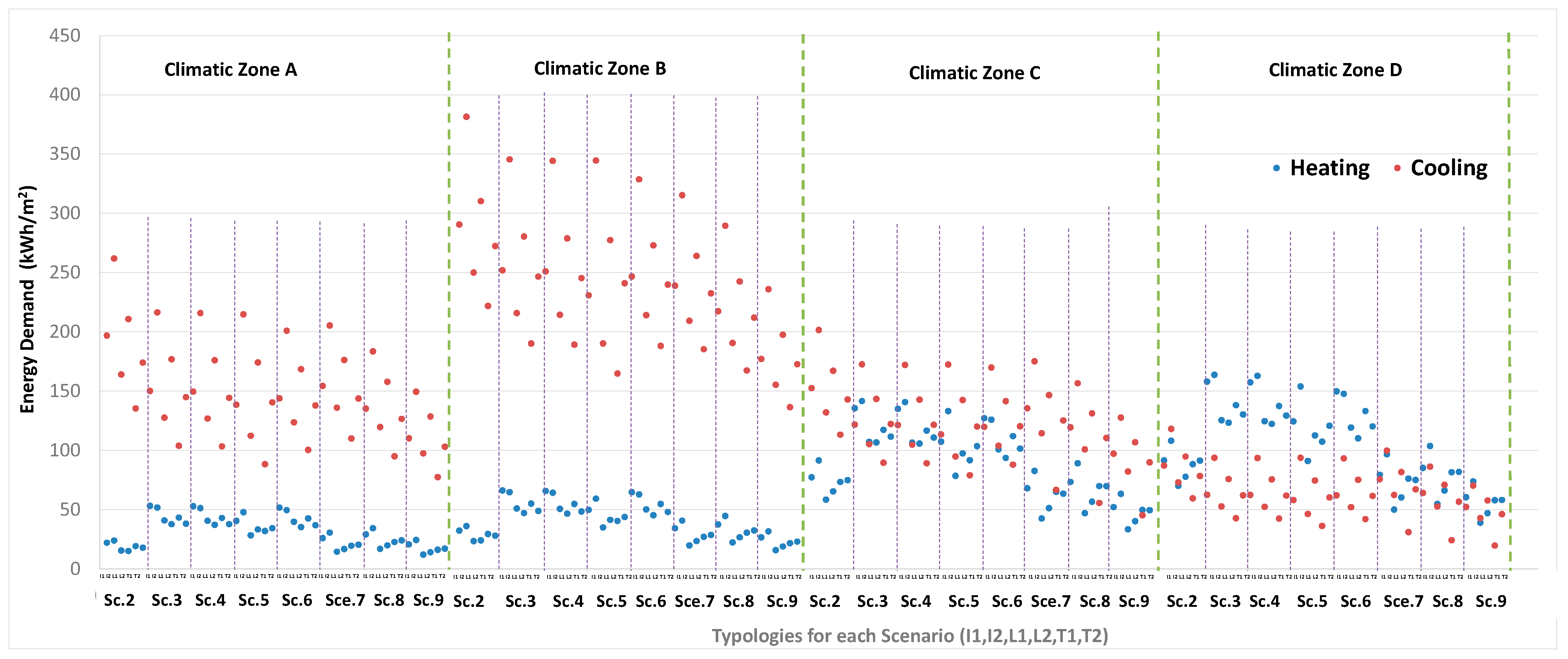 | 9. HVAC: Scenario 8 + Improved heating and air-conditioning system | Typology T1 shows the highest improvement in colder climatic zones C and D with a rate of 33.9%. |