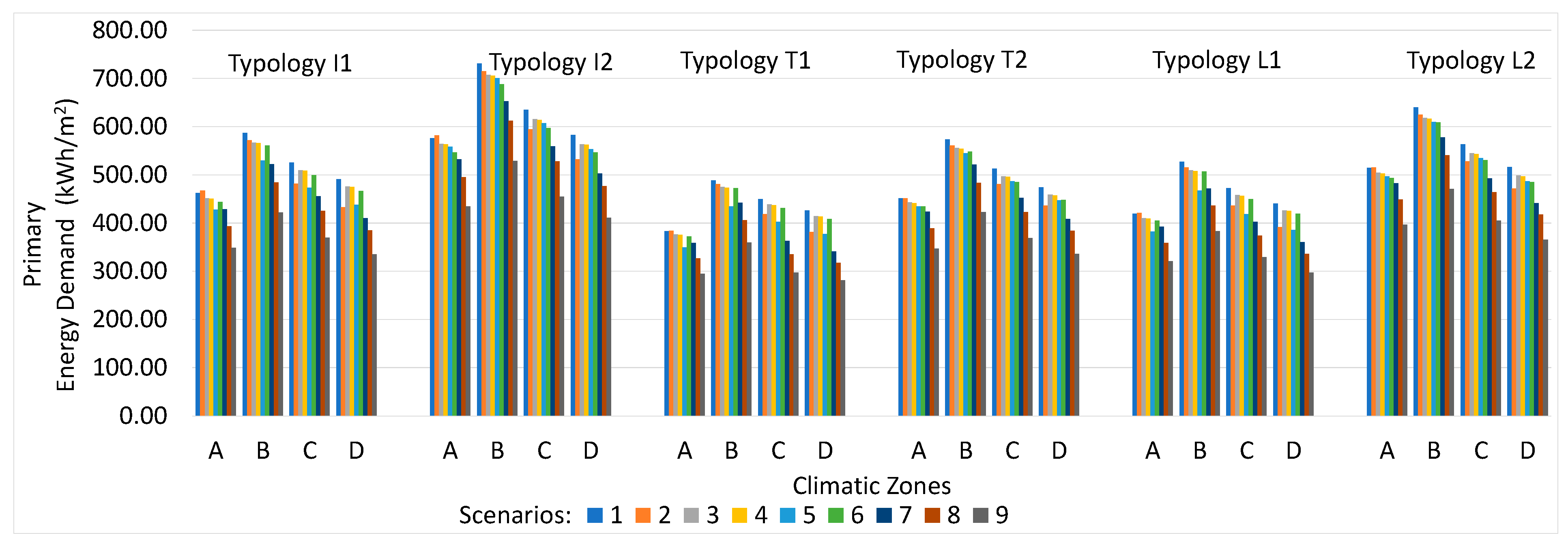 - Energy efficiency scenarios aimed to reduce building energy consumption (scenarios 3 to 9);
