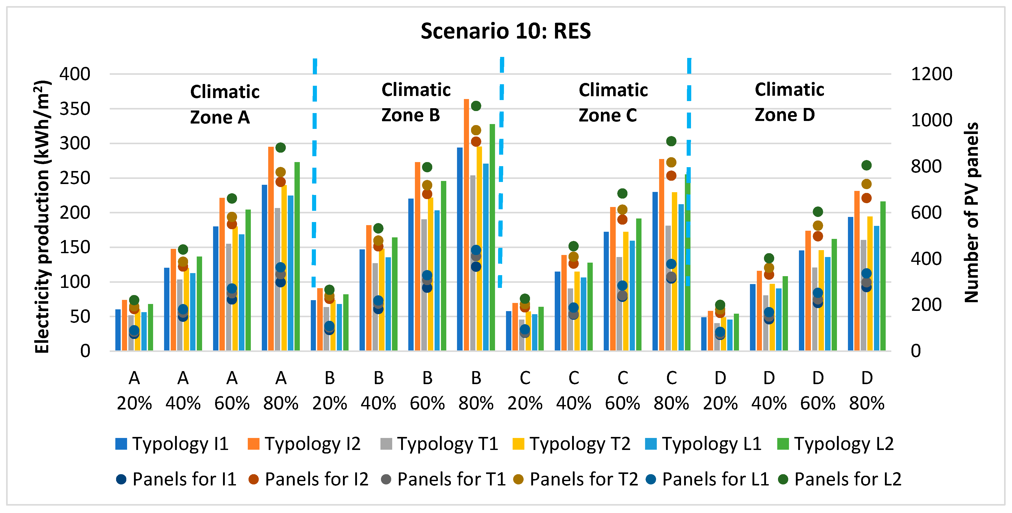 - Scenario RES: Scenario 9 combined with rooftop PV system (for four cases: 20%, 40%, 60%, 80% energy demand cover).