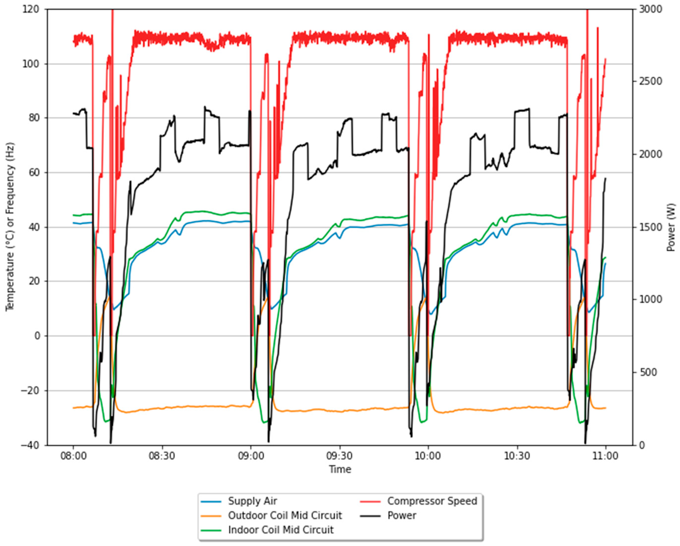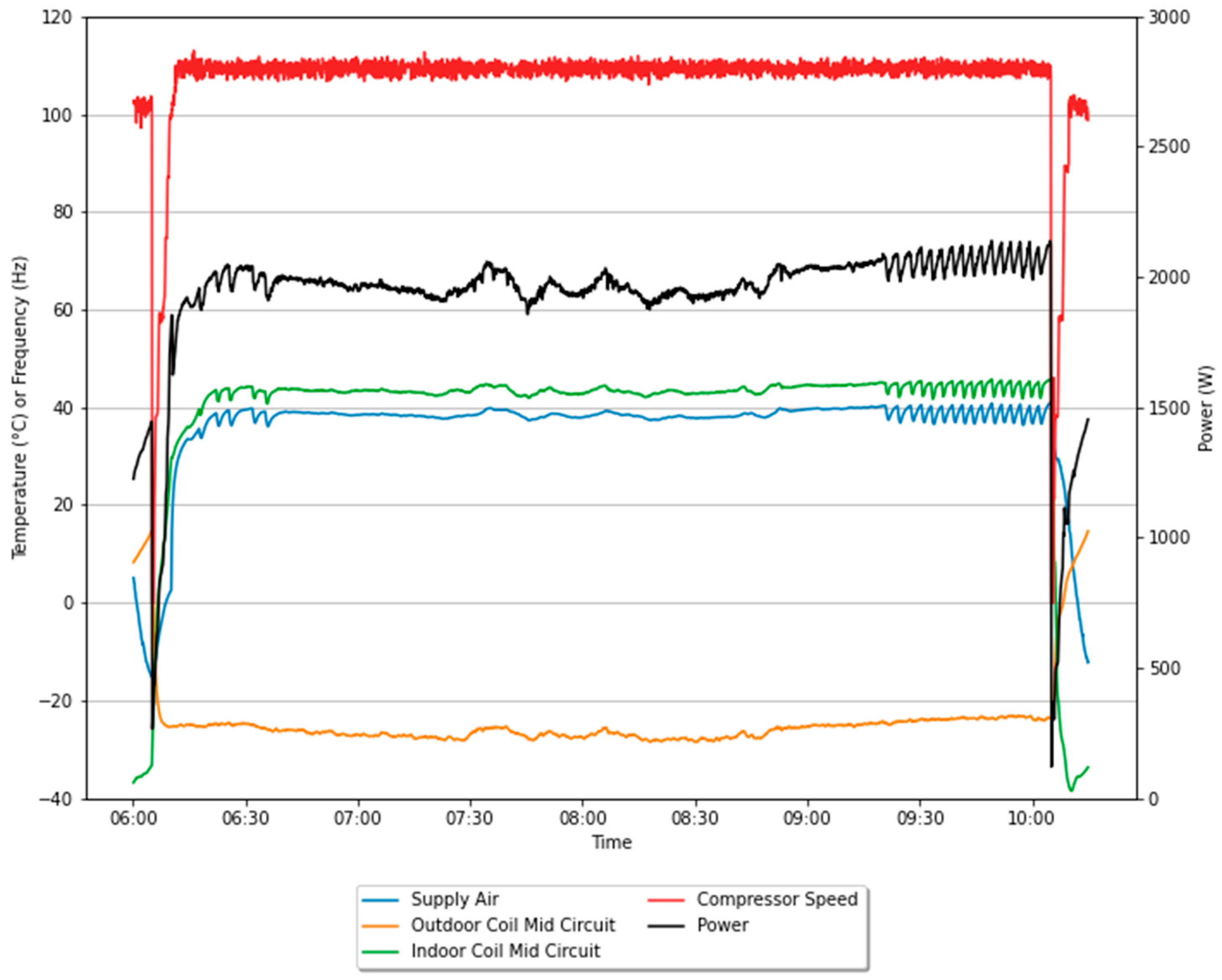 - The compressor starts in cooling mode, absorbing heat from the indoor coil and rejecting it to the outdoor coil. This is illustrated in Figure 1 by a combination of an increase in the compressor speed and power, a decrease in the indoor coil mid-circuit temperature, and an increase in the outdoor coil mid-circuit temperature.