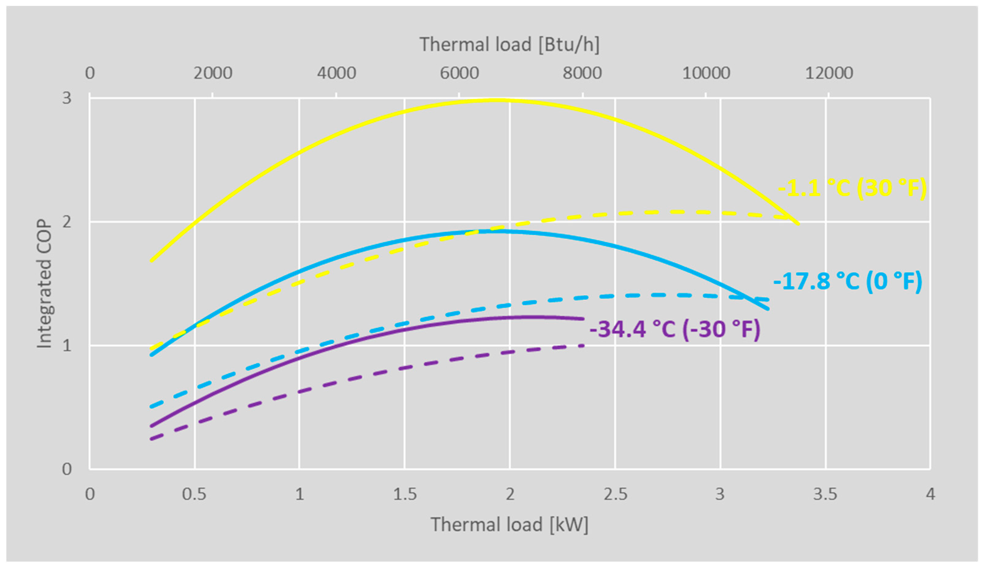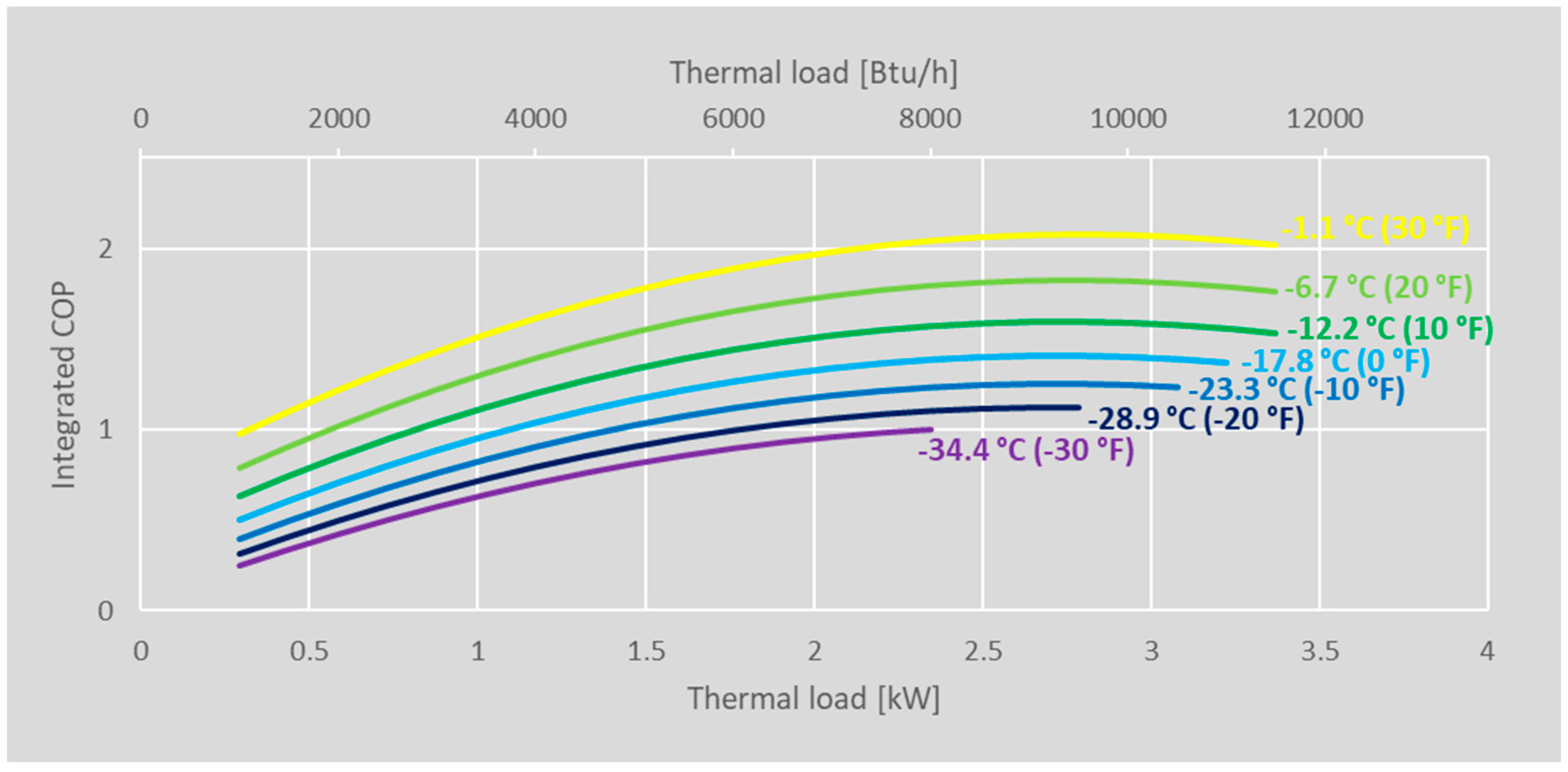 2.5. Integrated COP vs. Thermal Load and Outdoor Temperature