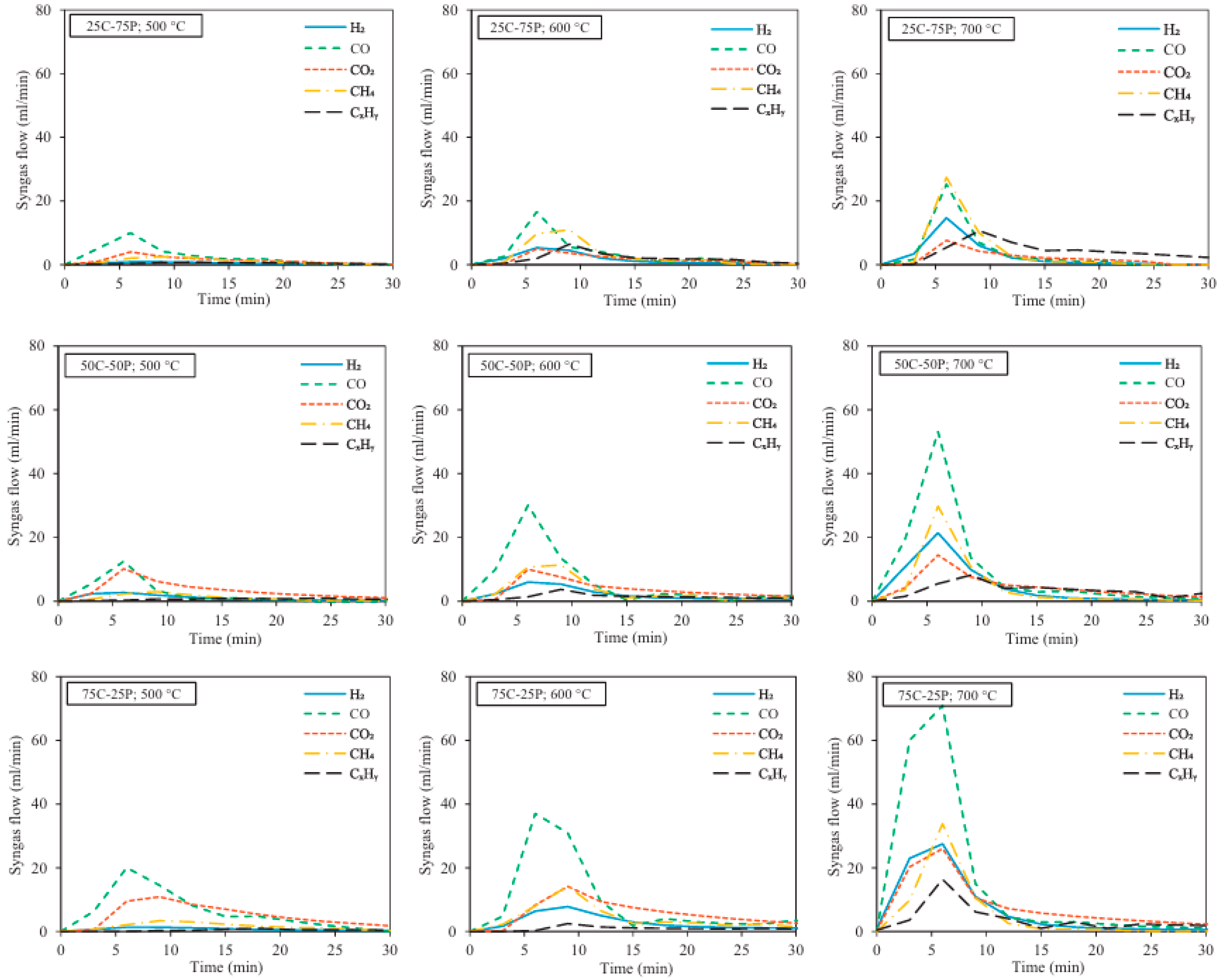 40]. For example, the flow rate of syngas produced by different RDF particles during pyrolysis at 500–700 °C in