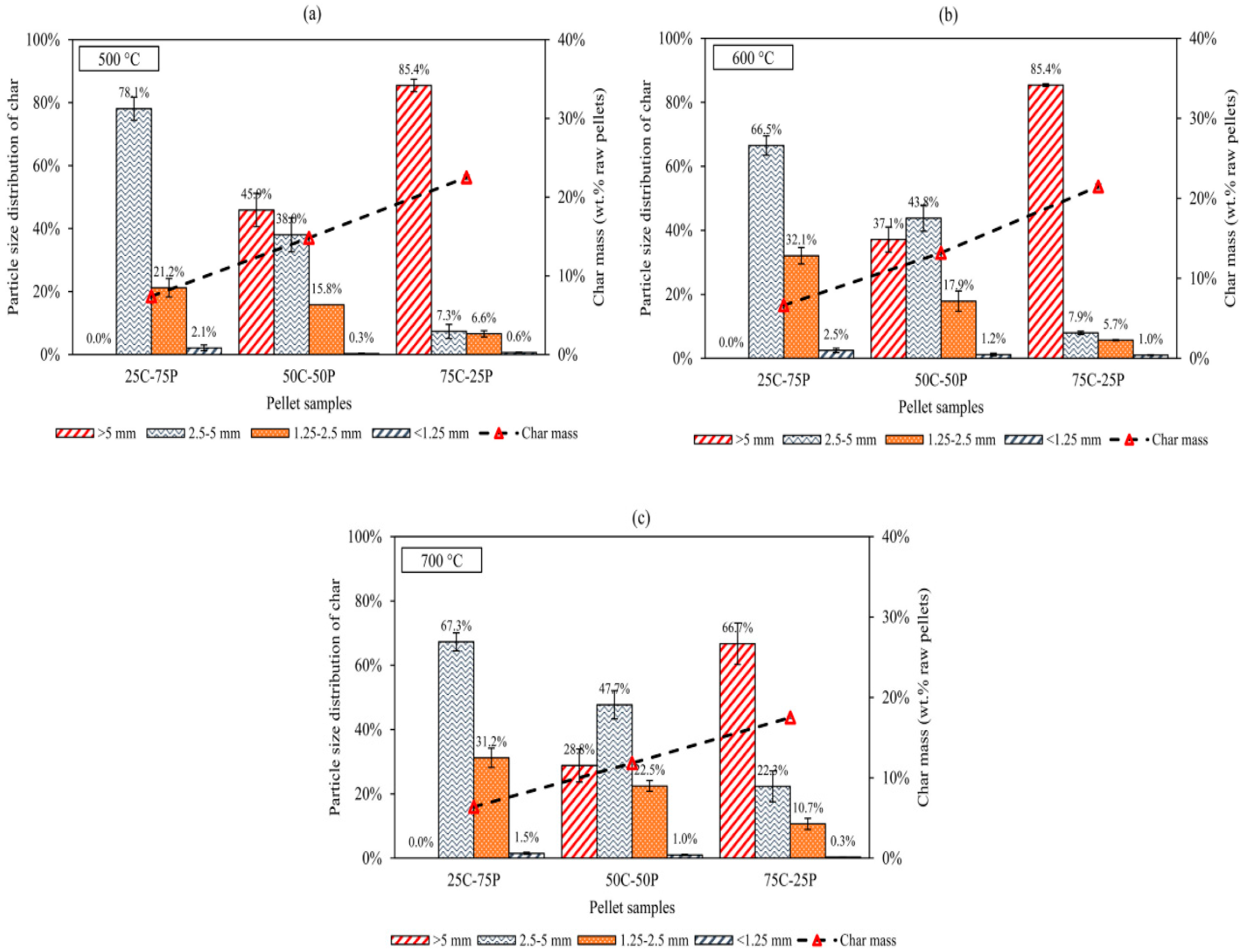 Figure 8 depicts the particle size distribution of char fragments obtained from pellets after 30 min of pyrolysis at different temperatures. Generally, increasing the pyrolysis temperature shifts the final char particle size distribution toward smaller sizes. This trend is particularly pronounced in samples with higher cardboard content. For example, with 75C–25P pellets, pyrolysis at 500 °C yields 85.4 wt% of char particles larger than 5 mm. This fraction decreases to 66.7 wt% at 700 °C. Concurrently, the proportions of smaller particles increase: the shares in the 2.5–5 mm and 1.25–2.5 mm size ranges rise from 7.3 wt% and 6.6 wt% to 22.3 wt% and 10.7 wt%, respectively.
