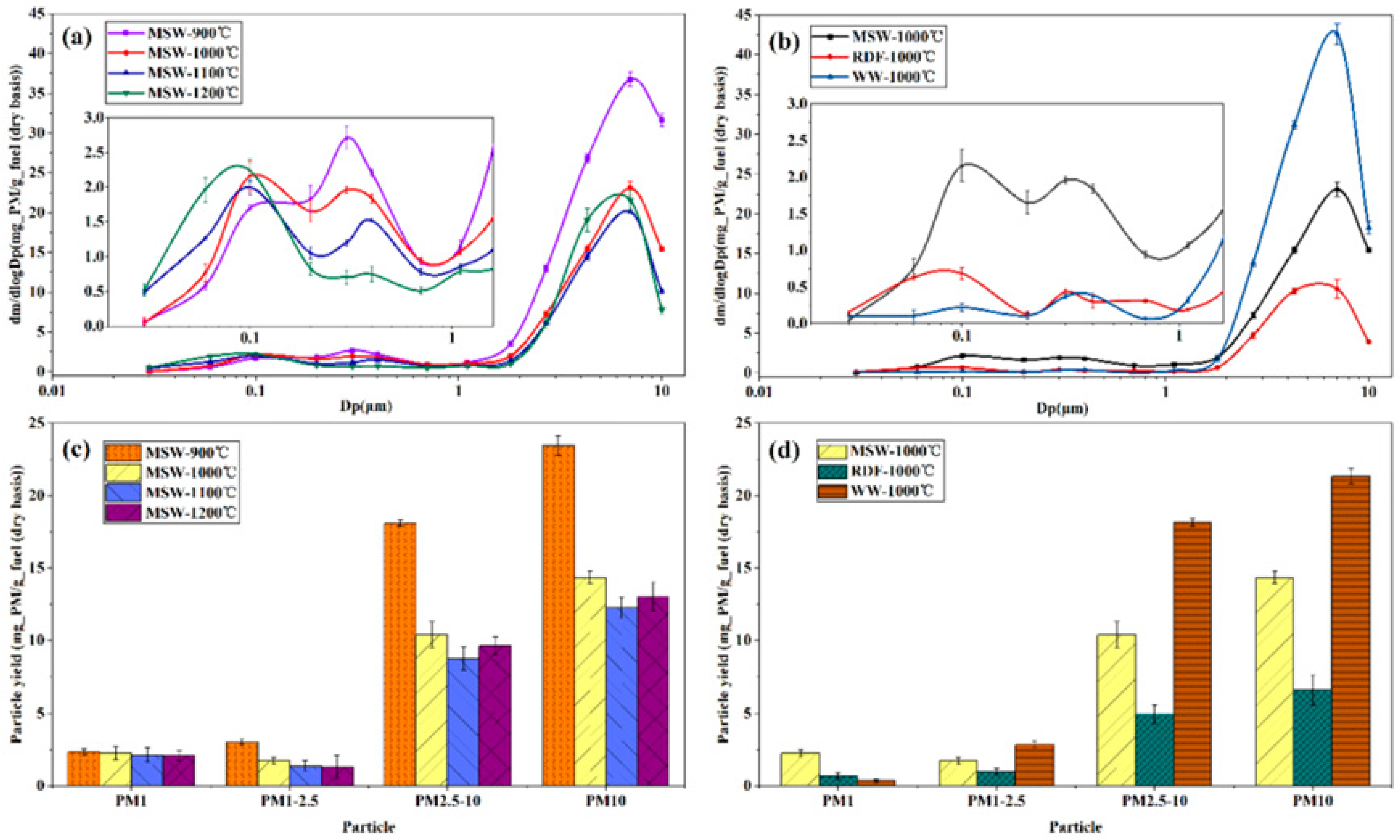 Figure 10d indicates that at a given temperature, PM1 yield follows the order: MSW > RDF > WW. In contrast, the yields of PM1–2.5, PM2.5–10, and PM10 all follow the sequence: WW > MSW > RDF [
