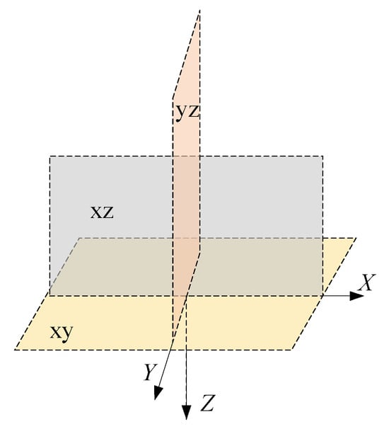 According to the simulation results, the upward migration component of the water phase can be reasonably neglected, which allows simplification of the boundary conditions at the upper surface in the seepage field model. Figure 4 illustrates the selection of the coordinate system plane. Figure 5 and Figure 6 illustrate the seepage effect of a 100 m × 200 m pipeline grounding grid, where the red regions represent regions with higher water content and the green regions represent the solid phase. The water phase within the bedrock exhibits an ellipsoidal distribution characterized by a thinner shape at both ends and a thicker middle section, indicating that gravity has a dominant influence on water migration. Correspondingly, the closer the location is to the infiltration holes in either the horizontal or vertical direction, the higher the water content.