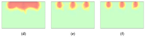 The humidification (seepage-induced) effect of the pipeline grounding grid through seepage holes is influenced by factors such as aperture size and spacing. Figure 2 illustrates the distribution of the seepage field at the humidification boundary under the action of seepage holes with a diameter of 5 cm and a spacing of 5 m in a 50 m × 50 m area. As shown in the figure, the seepage effect is most pronounced in the vicinity of the seepage holes, while the influence of the seepage field gradually weakens with increasing distance from the holes. Moreover, since the overall size of the grounding grid is much larger than the aperture and spacing of the seepage holes, and the holes are arranged uniformly, the seepage effect of a 100 m × 200 m pipeline grounding grid can be reasonably used to characterize the large-scale seepage field, as shown in Figure 3.