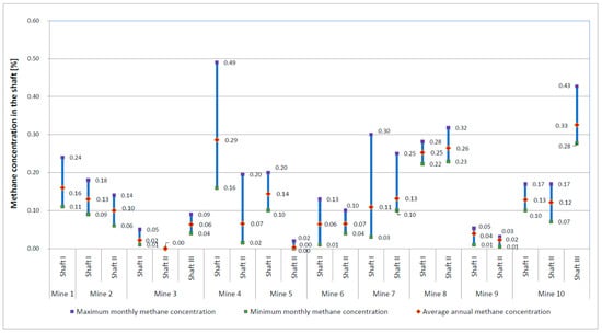 Polish mining regulations stipulate that the maximum permissible methane concentration at the air inlet to the longwall is 1.0%, at the outlet from the longwall it is 2.0%, at the outlet from the ventilation area it is 1.5%, and in the exhaust shaft it is 0.75%. Mine ventilation services select the ventilation airflow to ensure that the permissible concentrations are not exceeded at any point. As a result, actual methane concentrations in the exhaust shaft do not exceed 0.7% by volume. Possible momentary exceedances may occur in the case of an unpredictable, sudden methane outburst or other failure, and are associated with the evacuation of personnel from the mine’s underground sections. Figure 2 shows the ventilation methane (VAM) concentration values in each exhaust shaft in the selected mines in Poland, indicating the highest and lowest methane concentrations, based on average monthly measurements from 2023. The average annual value of these measurements is also given. The highest methane concentration was recorded in shaft I of mine No. 4, at 0.49%. The highest average value, 0.33%, was recorded in shaft III of mine No. 10.