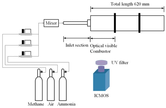 In an NH3-CH4 combustion, the blending ratio directly influences flame stability, ignition characteristics, combustion efficiency, flame propagation, and NOx formation [9,18]. The optical diagnostics of flames are important tools for combustion mechanism studies due to their non-intrusive and a wide field of view [19,20,21]. During combustion, various electronically excited radicals, such as OH*, CH*, NH*, CO2*, and NH2*, are produced [22]. These species act as intermediates in chain reactions and are typically concentrated in regions of intense reaction, with spontaneous radiation at characteristic wavelengths. Measuring flame-emission characteristics under well-controlled laboratory conditions over a range of different blending ratios provides valuable data for elucidating the combustion mechanisms of NH3-CH4 mixtures, validating numerical simulations, enabling precise control of the combustion process, and supporting pollutant-mitigation strategies.