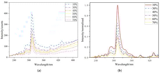 The flame radiation spectra obtained at different XNH3 were analyzed from several perspectives, including the characteristic spectral features of the flame and the relationships between XNH3 and radical intensity ratios. Figure 2a shows the raw radiation spectra measured under the conditions described in Section 2.1, focusing on the wavelength range from 220 to 500 nm. Because emitting species such as CO2*, and combustion products including H2O and CO2 exhibit broadband emission, baseline points were selected to fit the underlying broadband emission curve. This fitted baseline was then subtracted from the raw spectra to improve the accuracy of the line-emission data. The corrected spectra were then normalized using the peak intensity of all the spectra. The resulting normalized spectral distributions are shown in Figure 2b. The spectra at different ammonia blending ratios share several common features: radiation peaks are observed near 250, 310, 337, 390, and 430 nm, corresponding to NO*, OH*, NH*, CH(B–X), and CH(A–X), respectively. These spectral features confirm the presence of NO*, OH*, NH*, and CH* chemiluminescence in flames with NH3 addition. As the XNH3increases, the absolute chemiluminescence intensity of these radicals decreases, whereas the relative contribution of broadband emission from products such as H2O and CO2 increases. Under otherwise identical conditions, the time-averaged integrated chemiluminescence intensity progressively decreases with increasing XNH3, indicating a reduction in the overall reaction activity.