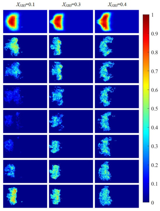The value of XNH3 also strongly affects the spatial distributions of the three radicals. At XNH3 = 0.10, the CH*, OH*, and NH* chemiluminescence fields are highly similar, indicating that the three radicals are generated at comparable locations and are approximately uniformly distributed within the reaction zone. As XNH3 increases, however, the OH* and NH* distributions gradually deviate from that of CH*, and these differences become more pronounced with increasing XNH3. At XNH3 = 0.30 and 0.40, the OH* and NH* fields are noticeably more elongated downstream than the CH* field. This behavior arises because, at low XNH3, the fuel contains a high fraction of CH4, so the flame dynamics are primarily governed by CH4 oxidation. Under these conditions, CH* is the dominant chemiluminescent product. At higher XNH3, combustion is instead dominated by NH3, and NH* is mainly formed via the reaction NH2 + H → NH + H2, so its emission is directly linked to the local NH3 concentration. Furthermore, the relatively slow overall reaction rate of NH3 leads to a longer flame and, consequently, to a more elongated OH* and NH* emission region. These observations demonstrate that, at low XNH3, CH* chemiluminescence can be used as a direct indicator of the flame reaction zone and overall reaction rate, whereas at higher XNH3 the OH* and NH* chemiluminescence distributions must also be considered.