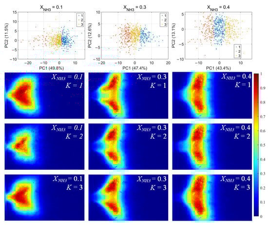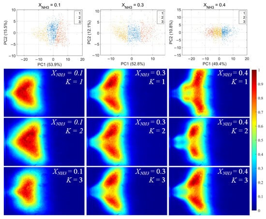 For each flame image, 46 morphology features were calculated, including the mean and standard deviation of the grayscale, the flame area and perimeter, the equivalent circular radius, the principal gradient direction, and the raw moments, central moments, and Hu invariant moments, forming a 46-dimensional feature vector. After standardizing these feature vectors, principal component analysis (PCA) was first applied to extract the principal directions in feature space. Then, k-means clustering was performed for unsupervised classification, dividing the samples into three clusters for each value of XNH3. The clustering results and the corresponding average flame images for each cluster are shown in Figure 10. Among the principal components, PC1 is the primary dimension describing flame morphology, with strong contributions from the mean grayscale, flame area, equivalent radius, and low-order raw moments. A small PC1 score corresponds to low overall brightness in the radical chemiluminescence images and a small flame area, indicating that the radical distribution is in a contracted state. Conversely, a large PC1 score indicates high imaging brightness and a large flame area, with the radical distribution in an expanded state. PC2 is mainly associated with the grayscale standard deviation, the directional gradient frequency, the central moments, and the Hu-invariant moments. A smaller PC2 score indicates a more uniform grayscale distribution in the image, whereas a larger PC2 score corresponds to stronger image contrast, more pronounced edge wrinkling, and a more elongated flame shape. Comparing Figure 10, Figure 11 and Figure 12, PC1 accounts for the majority of the variance between clusters and thus represents the main axis of classification under different combustion conditions.
