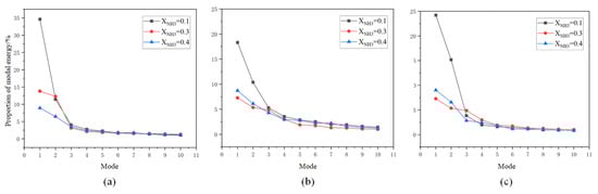POD modes of OH* chemiluminescence at different ammonia blending ratios: (a) 10%, (b) 30%, and (c) 40%.