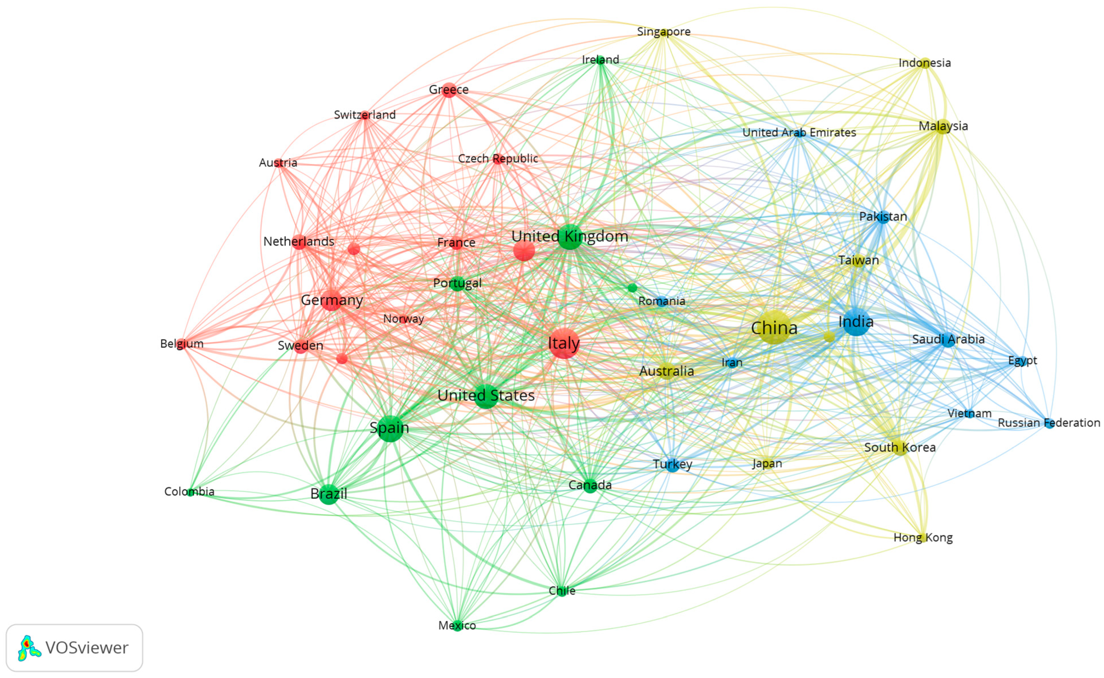 - Country co-authorship analysis maps collaboration patterns by examining joint publications among nations, highlighting the geographical structure of the research network.
