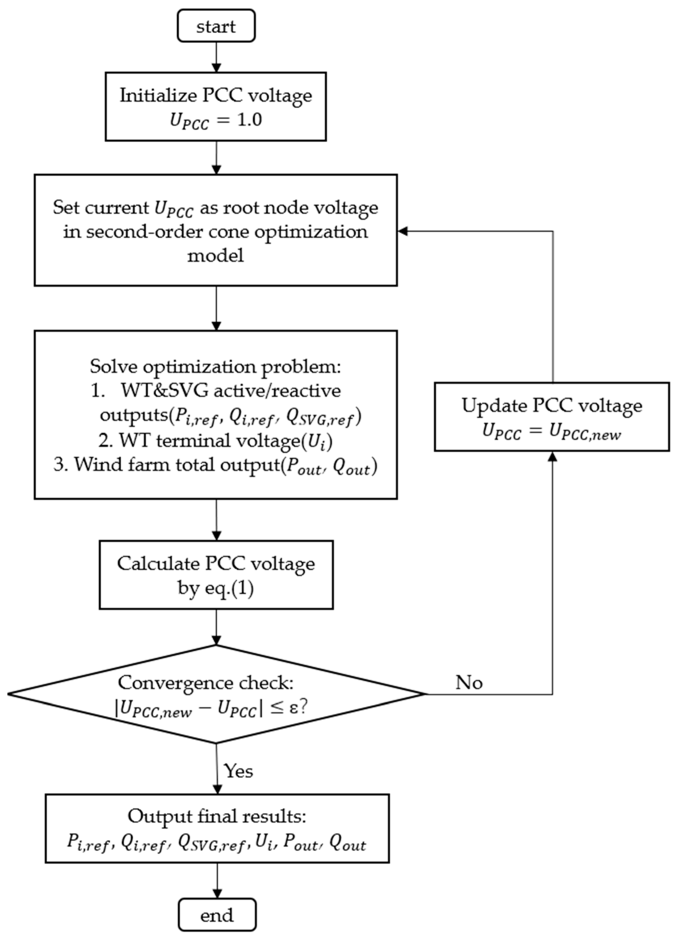 PCC. This updated PCC voltage is iteratively fed back into the second-order cone optimization model until the difference between the PCC voltages from two consecutive iterations falls below the allowable error, at which point the iteration terminates. The iterative process is shown in