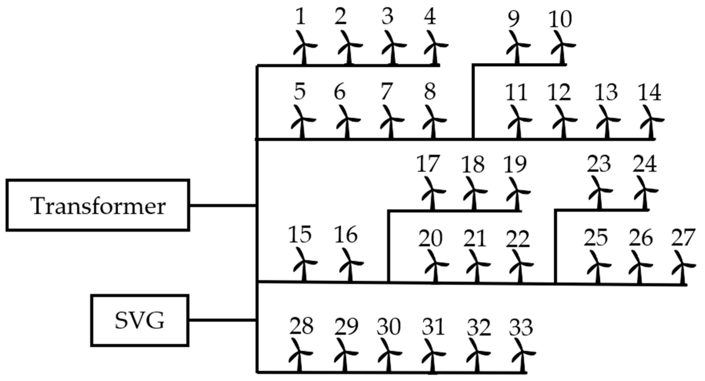 In a typical large-scale wind farm in China, there are over a hundred wind turbine units. Depending on the terrain, the distance between each unit ranges from several hundred meters to several kilometers. Consequently, the length of a feeder from start to end often spans several kilometers to several tens of kilometers. According to data measured from a specific wind farm, under heavy load conditions, the voltage difference between the low-voltage busbar at the wind farm’s step-up substation and the terminal node of a feeder can reach 5%. Therefore, reactive power and voltage control in a wind farm should not only focus on the PCC (Point of Common Coupling) voltage but also consider the internal voltage distribution within the wind farm.